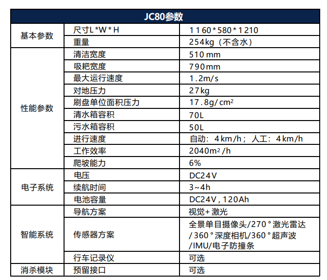 J C 8 0 專 為 各 類 商用場景室內區域提供地面清潔解決方案 ,能夠自主規劃工作路徑和避障 , 自動清掃、消毒。配備微秒級自研智能系統 , 實時響應,實時顯示,安全避障 。主動規劃清潔路徑,高效清洗消殺地面 , 構建美好商業環境。